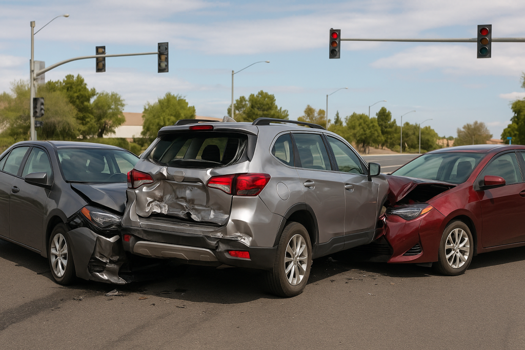 Crashes at stoplights, stop signs, or while making left/right turns — very common in busy cities like Las Vegas.